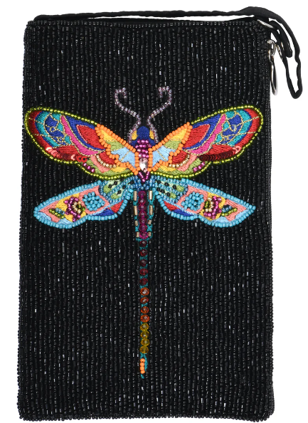 Our Colorful Dragonfly is sure to bring you good fortune in the form of compliments. Bright embroidery is melded with intricate beading to create a memorable dragonfly. Set over shiny jet black beads the look is striking and beautiful. Black raw silk interior pocket and reverse.